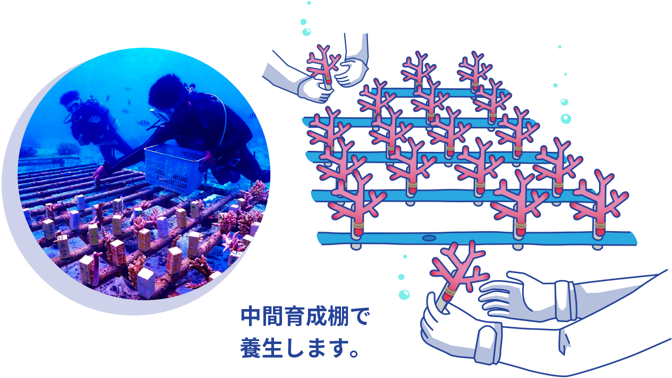 ほとんどのサンゴは年に1度、満月前後の夜に産卵を行います。産卵によって受精したサンゴは1mm程度の「プラヌラ幼生」となり自ら遊泳することが出来ます。約1~2週間程で岩などに固着後、数日で「ポリプ」と呼ばれる状態になり、自身のコピーをどんどん増やし、その後炭酸カルシウムで作られた骨格を形成します。そうして長い年月をかけ、親サンゴに育っていきます。